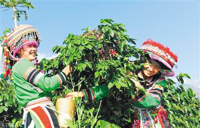 圖為咖農(nóng)在新寨萬(wàn)畝咖啡示范園內(nèi)采摘咖啡豆。