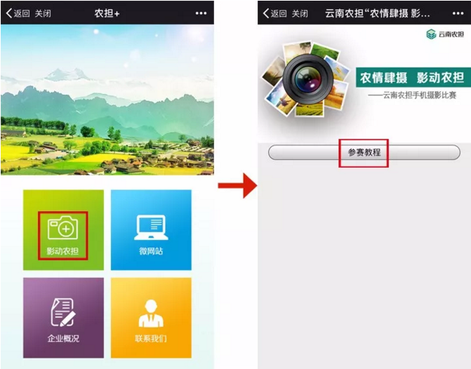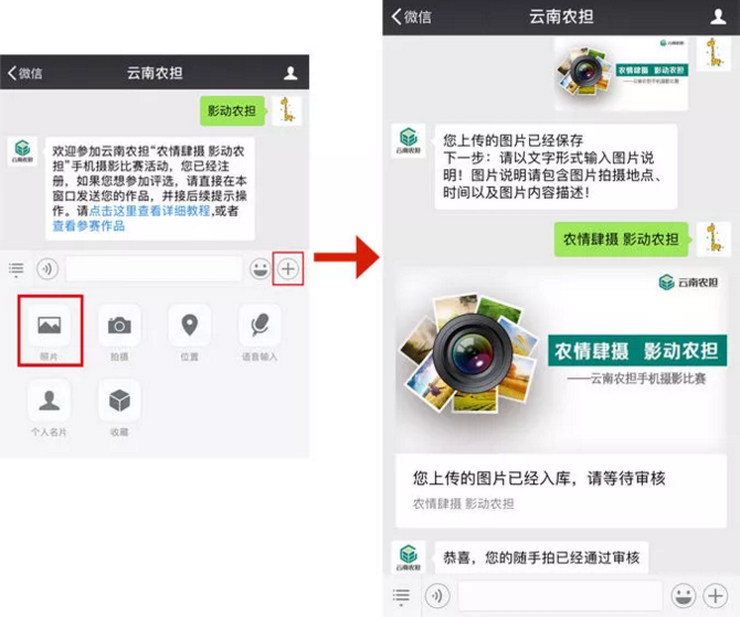 參與方式二:關注“云南農(nóng)擔”官方微信號,點擊“農(nóng)擔+”欄目,選擇“影動農(nóng)擔”進入,查看教程后,完成信息錄入,在對話框內發(fā)送1張圖片及一句話描述即可。
