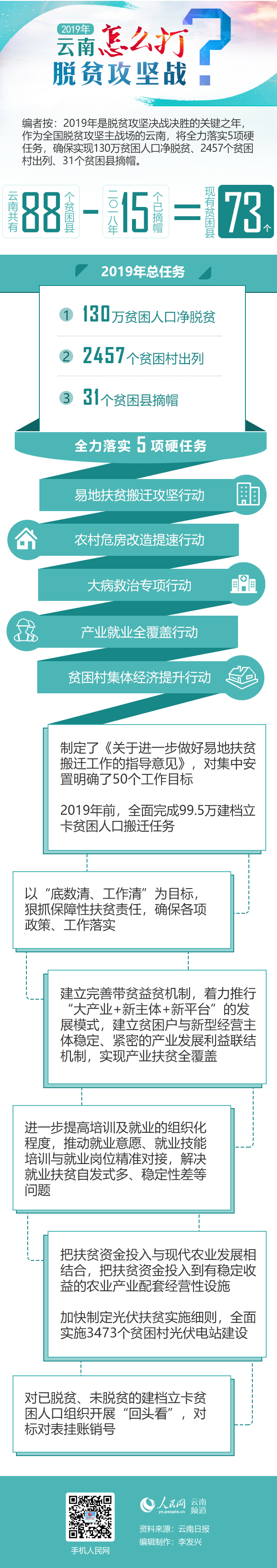 2019年是脫貧攻堅決戰(zhàn)決勝的關(guān)鍵之年,作為全國脫貧攻堅主戰(zhàn)場的云南,將全力落實易地扶貧搬遷攻堅行動、農(nóng)村危房改造提速行動、大病救治專項行動、產(chǎn)業(yè)就業(yè)全覆蓋行動、貧困村集體經(jīng)濟提升行動5項硬任務(wù),確保實現(xiàn)130萬貧困人口凈脫貧、2457個貧困村出列、31個貧困縣摘帽。