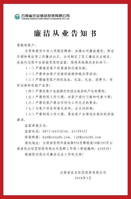 《廉潔從業(yè)告知書》的規(guī)定共有八條,對(duì)業(yè)務(wù)人員在接受客戶宴請(qǐng)和住宿安排,收受客戶的紀(jì)念品、禮品、禮金、消費(fèi)卡、有價(jià)證券和農(nóng)副產(chǎn)品,參加客戶安排的旅游和娛樂(lè)活動(dòng),利用工作之便對(duì)客戶進(jìn)行刁難和吃拿卡要,與客戶存在利害關(guān)系應(yīng)主動(dòng)回避等方面都做出嚴(yán)格規(guī)定。告知書末尾留有公司的監(jiān)督電話、舉報(bào)郵箱和通訊地址等信息,以方便客戶進(jìn)行監(jiān)督舉報(bào)和信息反饋。