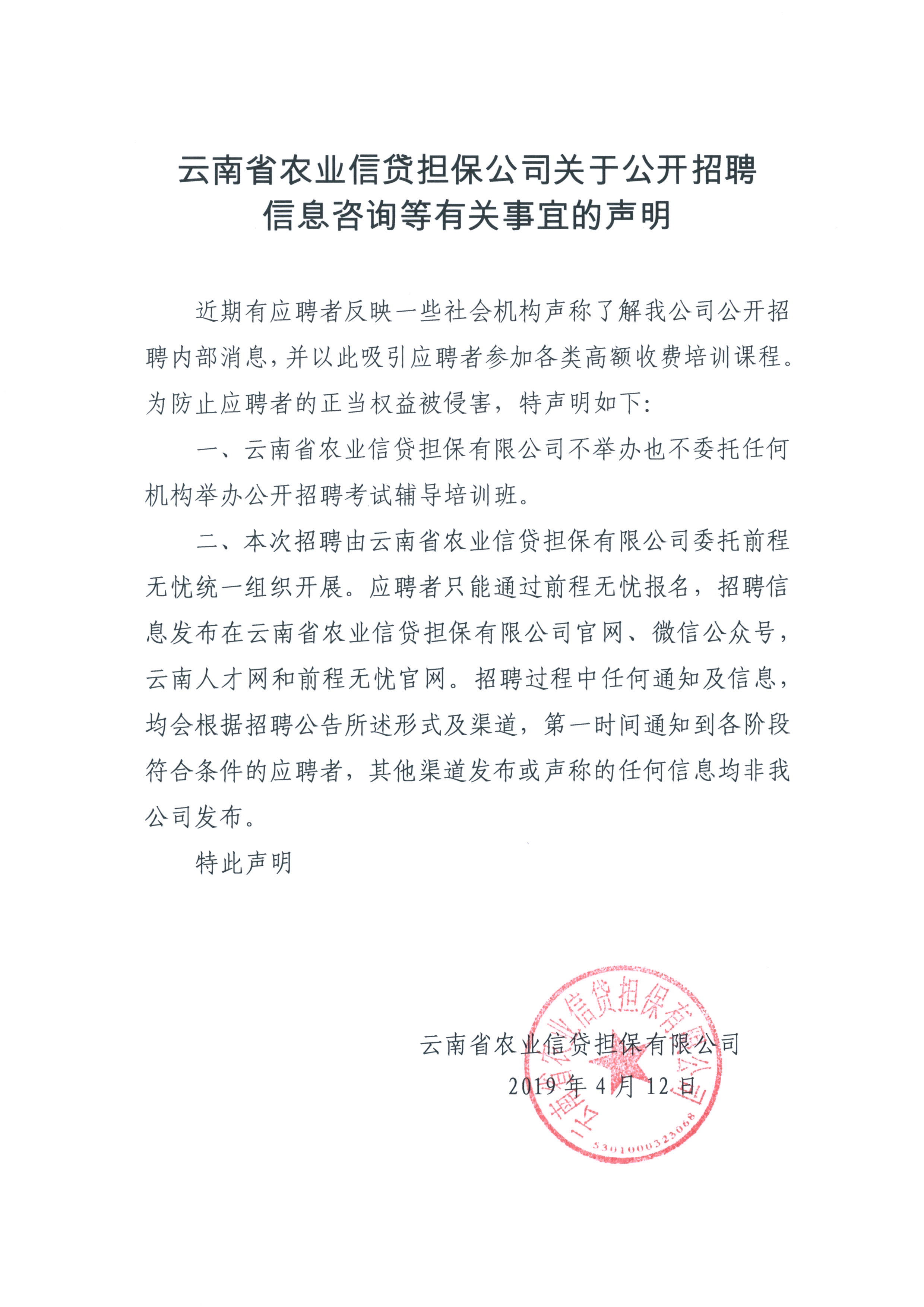 云南省農(nóng)業(yè)信貸擔(dān)保有限公司關(guān)于公開(kāi)招聘信息咨詢(xún)等有關(guān)事宜的聲明
