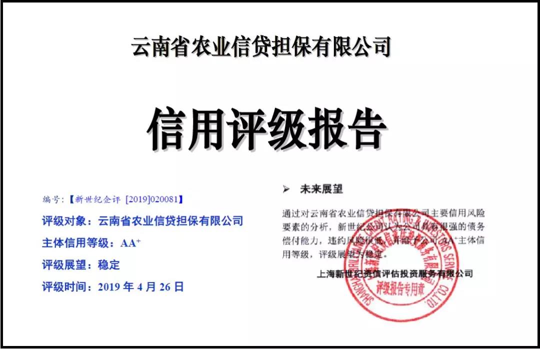 云南省農(nóng)業(yè)信貸擔(dān)保有限公司通過一年的努力,企業(yè)主體信用評級在2017年AA等級的基礎(chǔ)上再上一個臺階,2018年主體信用等級被評定為AA+,評級展望為“穩(wěn)定”,成為自全國農(nóng)業(yè)信貸擔(dān)保體系組建以來,第一批獲此殊榮的省級農(nóng)業(yè)擔(dān)保機(jī)構(gòu)。