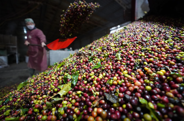 這2月22日在云南普洱市一家咖啡生產(chǎn)企業(yè)內(nèi)拍攝的新收購并準(zhǔn)備進行處理的咖啡鮮果。新華社記者 陳欣波 攝
