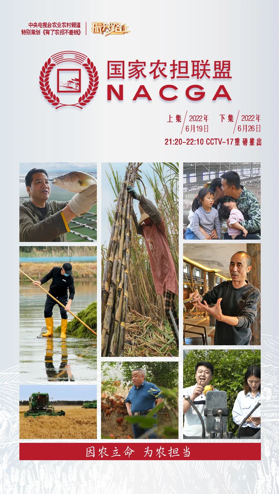 下集將展現(xiàn)四川、廣東、廣西、重慶等省級農(nóng)擔(dān)公司支持新型農(nóng)業(yè)經(jīng)營主體的農(nóng)擔(dān)故事。6月26日(周日)晚9點20分于CCTV-17頻道,敬請收看。