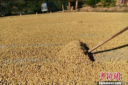圖為普洱咖農(nóng)在太陽下曬咖啡。任東攝