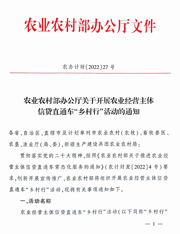 農(nóng)業(yè)農(nóng)村部印發(fā)通知開展農(nóng)業(yè)經(jīng)營主體信貸直通車“鄉(xiāng)村行”活動