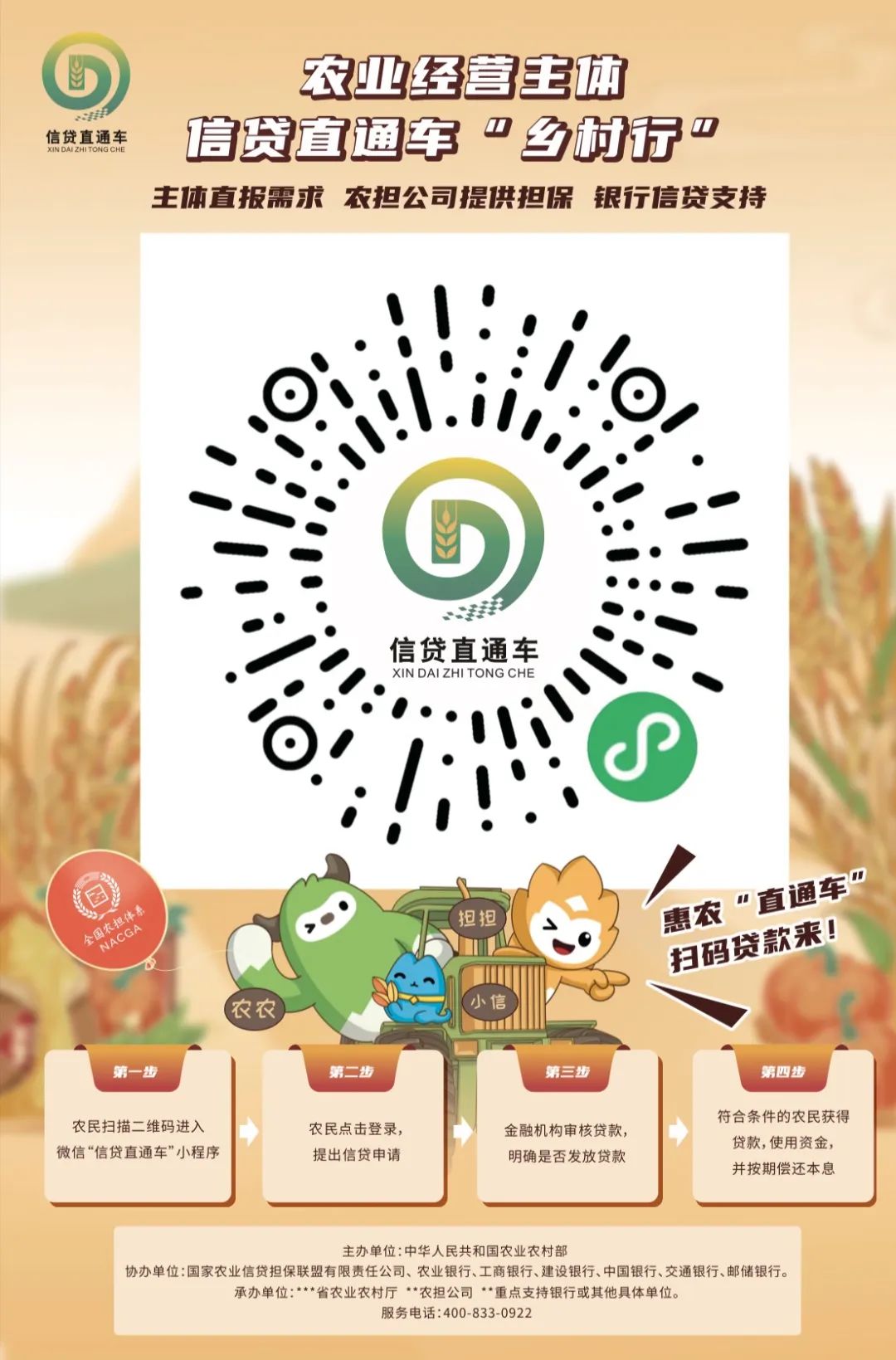 據(jù)悉,“鄉(xiāng)村行”活動將通過集中開展信貸直通車專題宣傳推廣,引導(dǎo)大中型銀行機(jī)構(gòu)服務(wù)下沉,將更多的農(nóng)業(yè)農(nóng)村信貸、擔(dān)保、信用、保險(xiǎn)等金融知識普及到村到戶,只需掃描宣傳掛圖中的二維碼即可提出融資需求,進(jìn)一步提升信貸直通車社會知曉度和品牌影響力,擴(kuò)大農(nóng)業(yè)經(jīng)營主體的覆蓋面和受益面,將更多金融資源引村入戶,助力今冬明春糧食生產(chǎn)和鄉(xiāng)村建設(shè)