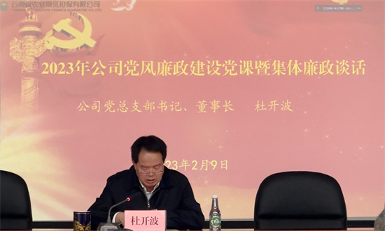 2月9日,云南省農業(yè)融資擔保有限公黨總支部書記、董事長杜開波在公司年度工作會議上,為全體職工上了一堂黨風廉政建設專題黨課,并作集體廉政談話。省公司全體職工、州市分支機構負責人、主管等現(xiàn)場聽課,各州市分支機構全員通過視頻方式聽課。