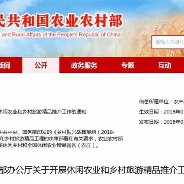 為落實今年中央一號文件和中共中央、國務(wù)院印發(fā)的《鄉(xiāng)村振興戰(zhàn)略規(guī)劃(2018-2022)》關(guān)于實施休閑農(nóng)業(yè)和鄉(xiāng)村旅游精品工程的決策部署和有關(guān)要求,農(nóng)業(yè)農(nóng)村部決定向社會推介一批中國美麗休閑鄉(xiāng)村和全國休閑農(nóng)業(yè)精品園區(qū)(農(nóng)莊)?,F(xiàn)將有關(guān)事項通知如下。