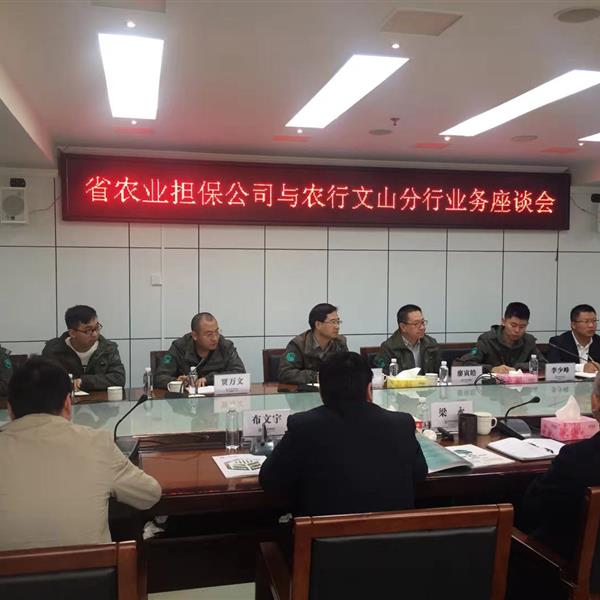 11月27日,省農(nóng)擔(dān)公司董事長郭影一行攜文山、硯山辦事處人員前往農(nóng)業(yè)銀行文山州分行參加座談。