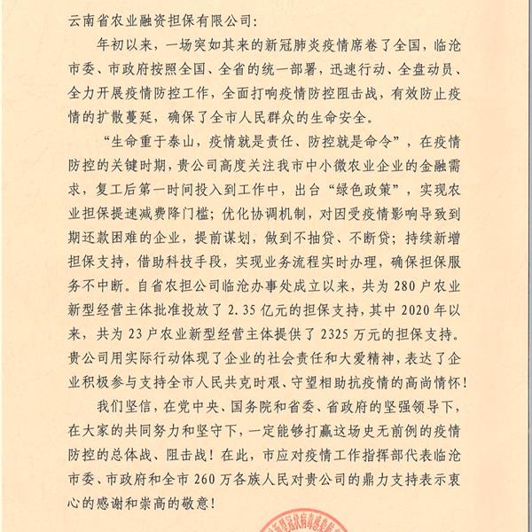 臨滄市應(yīng)對(duì)疫情工作領(lǐng)導(dǎo)小組指揮部向云南農(nóng)擔(dān)公司發(fā)來(lái)感謝函。
